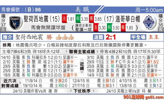 05:00 美職聯 聖荷西地震:溫哥華白帽
