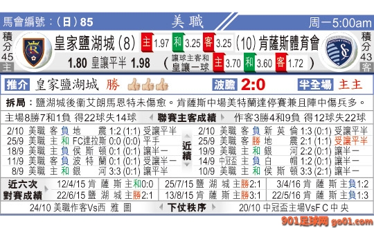 > 05:00 美職聯 皇家鹽湖城:肯薩斯體育會