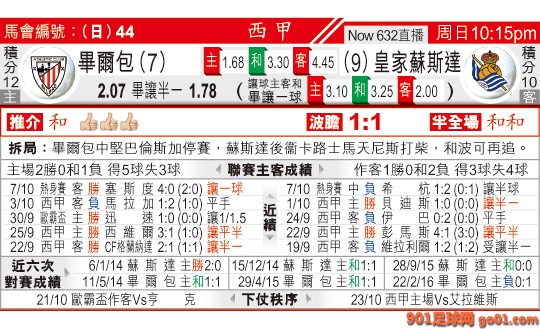 > 22:15 西甲 畢爾包:皇家蘇斯達
